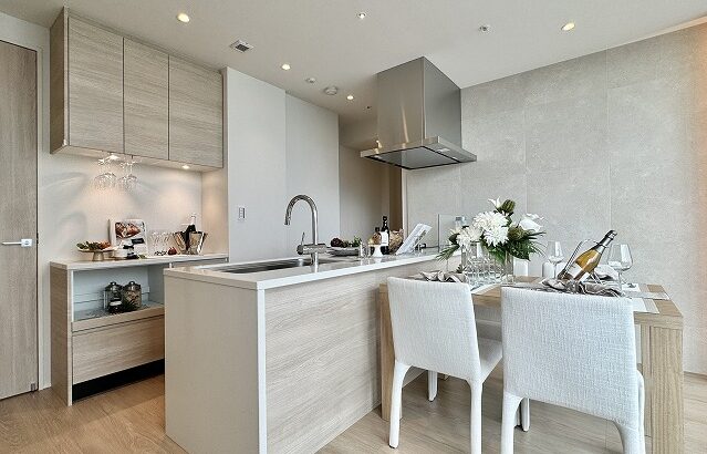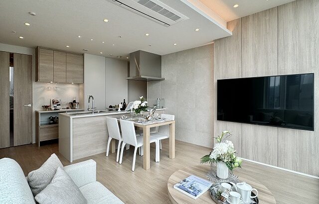 内装は木目の温もりとグレージュトーンの柔らかな色調が織りなす上質な空間デザイン。